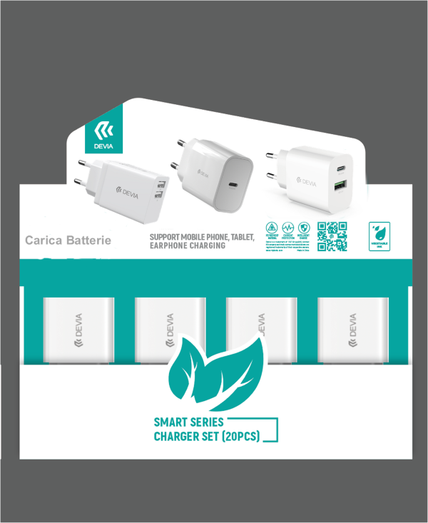 Il Set Espositore DEVIA Smart Series include 20 caricabatterie da muro universali con presa EU, suddivisi in modelli a ricarica rapida PD e QC e versioni doppia porta USB, ideali per rivenditori, punti vendita e corner di elettronica.