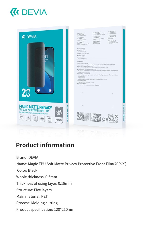 DEVIA Magic TPU Soft Matte Privacy Protective Front Film (20PCS)