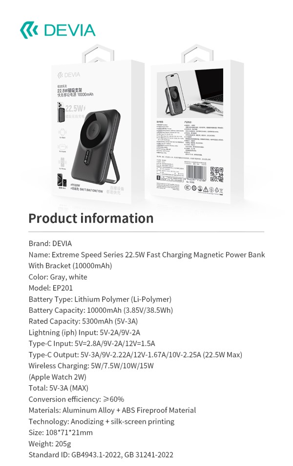 La DEVIA Extreme Speed Series 22.5W è una power bank magnetica ad alta velocità da 10.000mAh, progettata per offrire ricarica rapida, versatilità e design compatto.